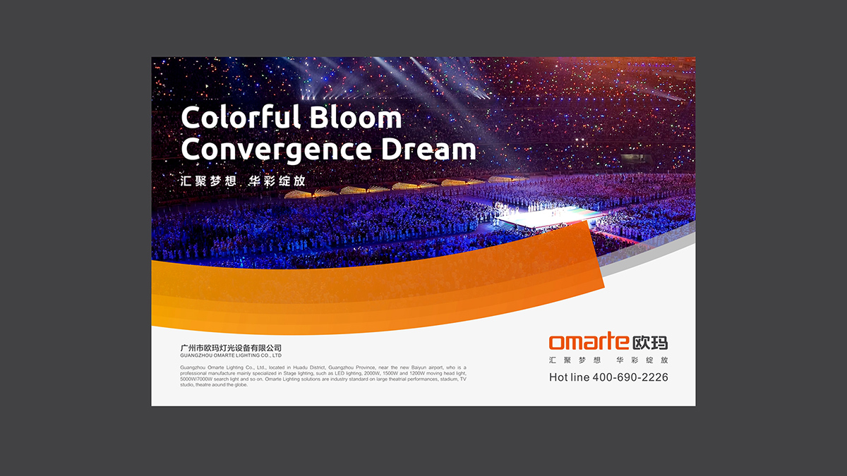 广州市欧玛灯光设备有限公司2005年创立,是集研发、生产、销售、服务于一体的综合型灯光企业,产品含电脑摇头灯、追光灯等,在广州花都有大型制造基地,销售服务网络遍布国内外。其“OMARTE”品牌以高性价比著称,国内销量多年领先,业内美誉度高,产品广泛应用于演出、场馆等场景,2012年成为电脑灯及LED灯具两项行业标准制定单位。