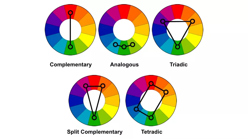 其他方案包括分割互补色(使用与主基色的互补色相邻的两种颜色);以及 矩形,基于两个互补对的四色方案;最后是正方形,这是另一种四色方案,其中与矩形不同,颜色是均匀分布的。