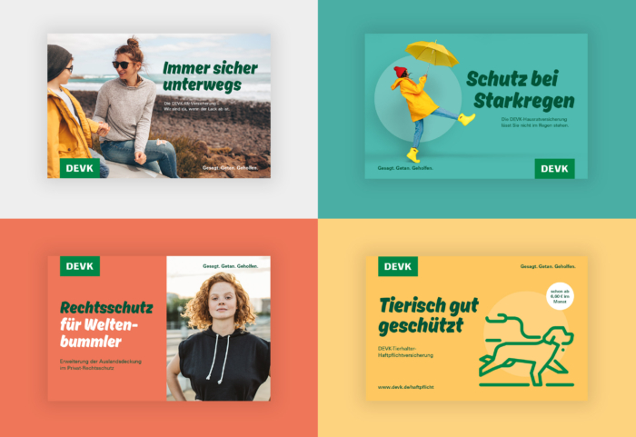 关于战略目标,主要目标是开发一种企业设计,通过每个接触点的每一个沟通措施,帮助传达品牌承诺“我们比其他人更积极地帮助人们”。一种可以在外部和内部发挥作用的企业设计。为了公平对待 DEVK 的具体组织结构,摒弃了严格、复杂的设计指南。