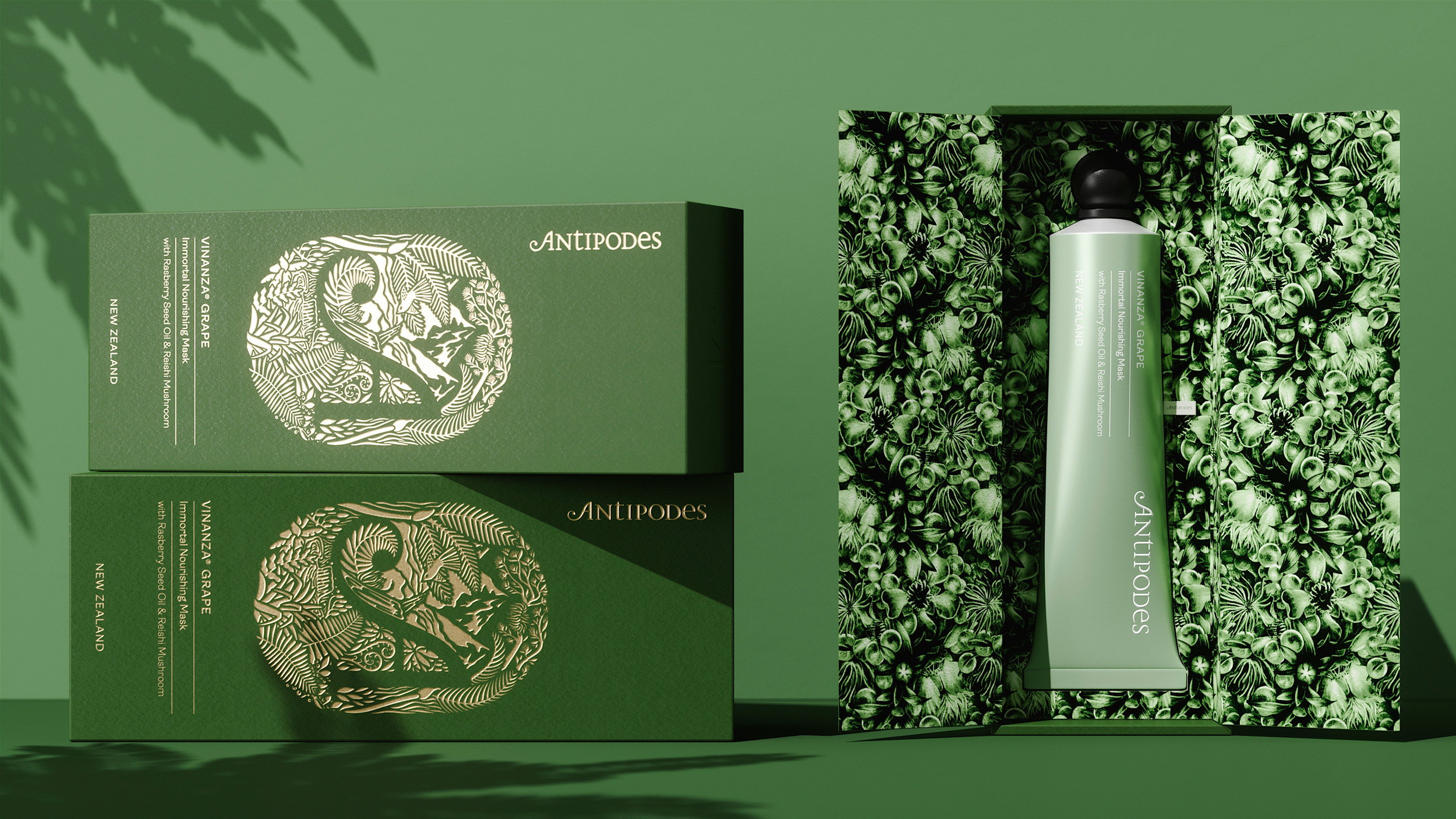 潜入包装内,产品隐藏在两层传单中,第一个传单带有浮雕金色徽标。下一篇是来自 Antipode 创始人 Elizabeth Barbalich 的引述;我们将其用作介绍每个产品发现的宣言。手工制作的图案是来自新西兰独特风景的天然成分的精致混合搭配。