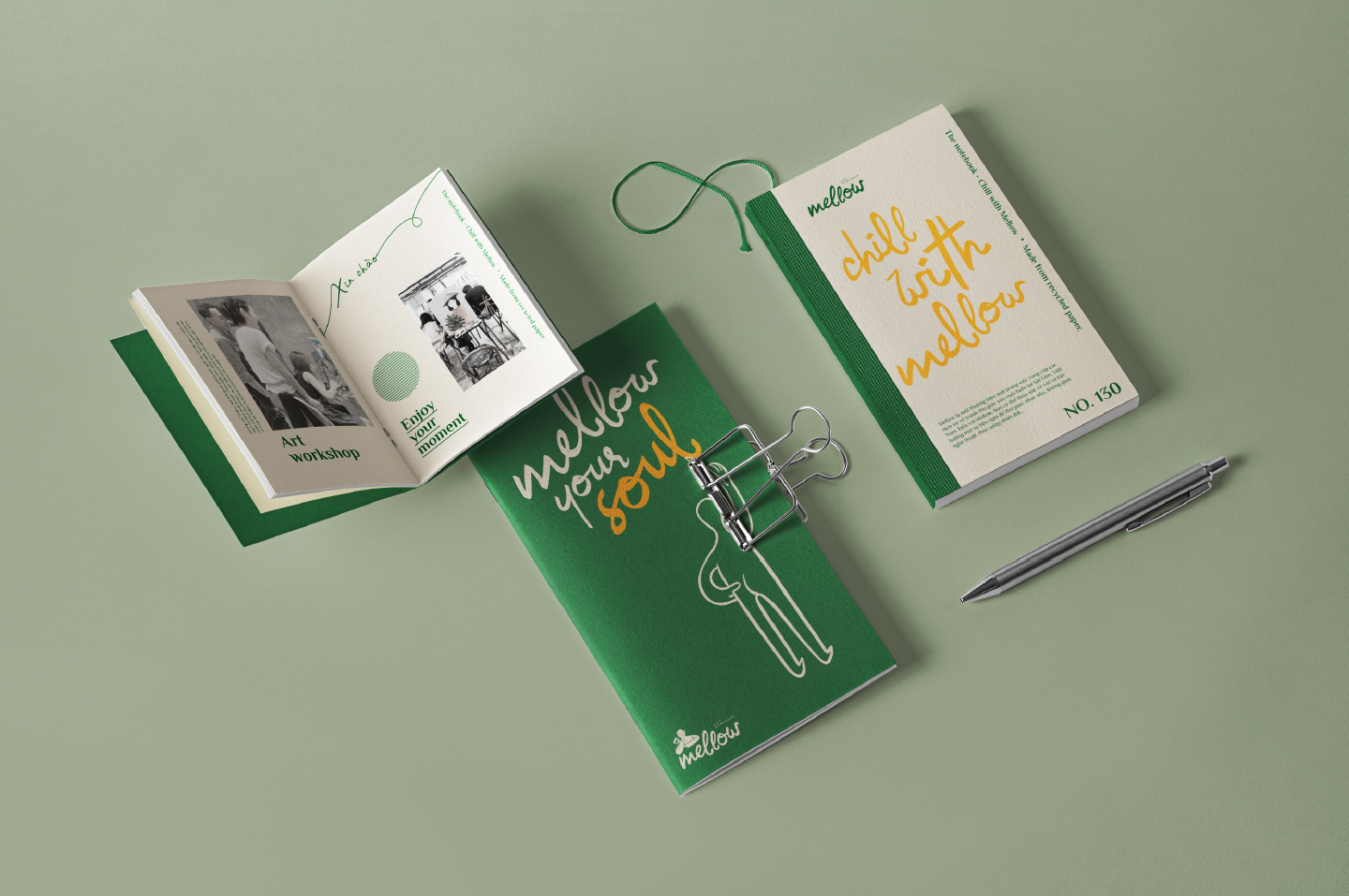 品牌形象设计的可视化是形状和字母的相互作用。我们使用了一种名为“Bulgatti”的带有柔和线条的手写字体,以在握笔时唤起自然感。标志象征着轻松的感觉和客户沉浸在创意空间中的喜悦。