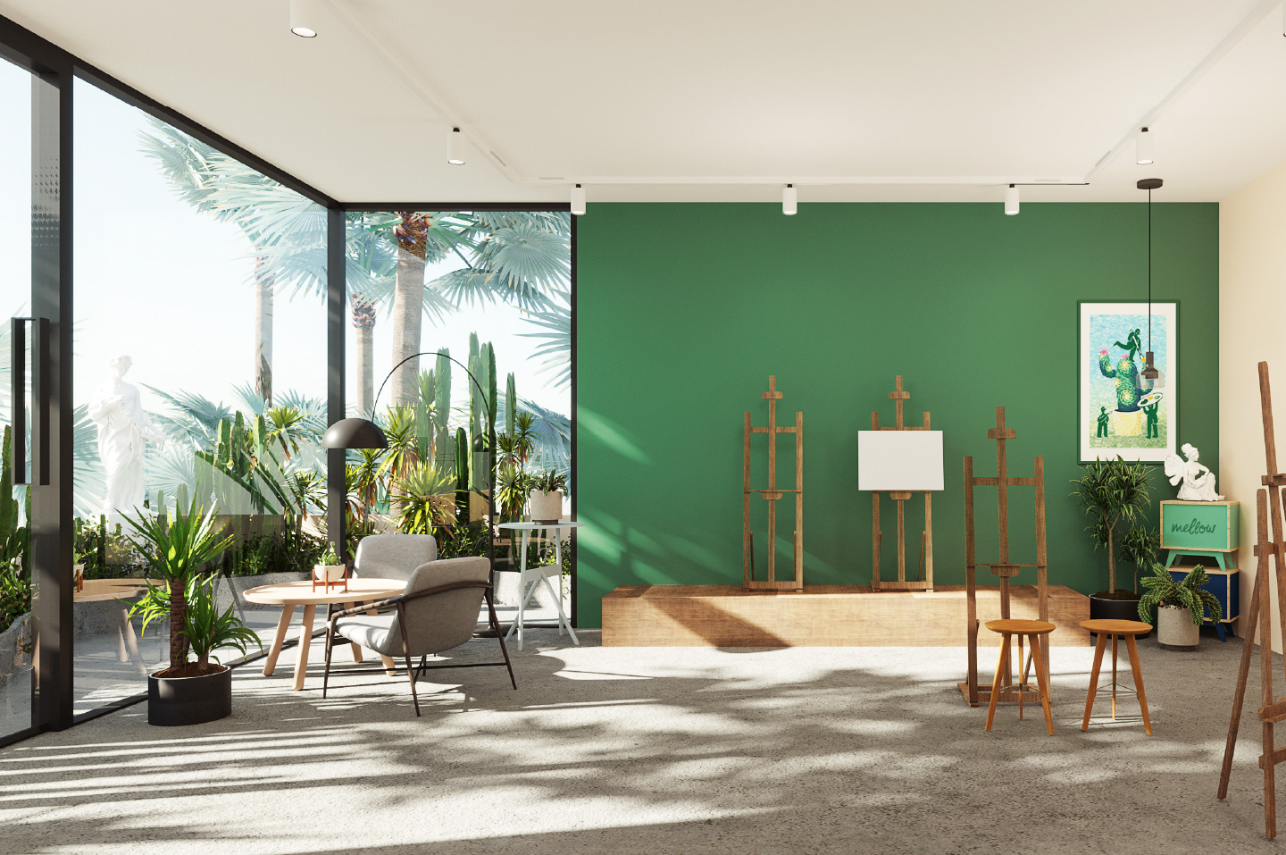 至于创意空间,我们通过使用面向阳台的透明玻璃层优化自然光,阳台上种满了仙人掌——该区域的亮点。