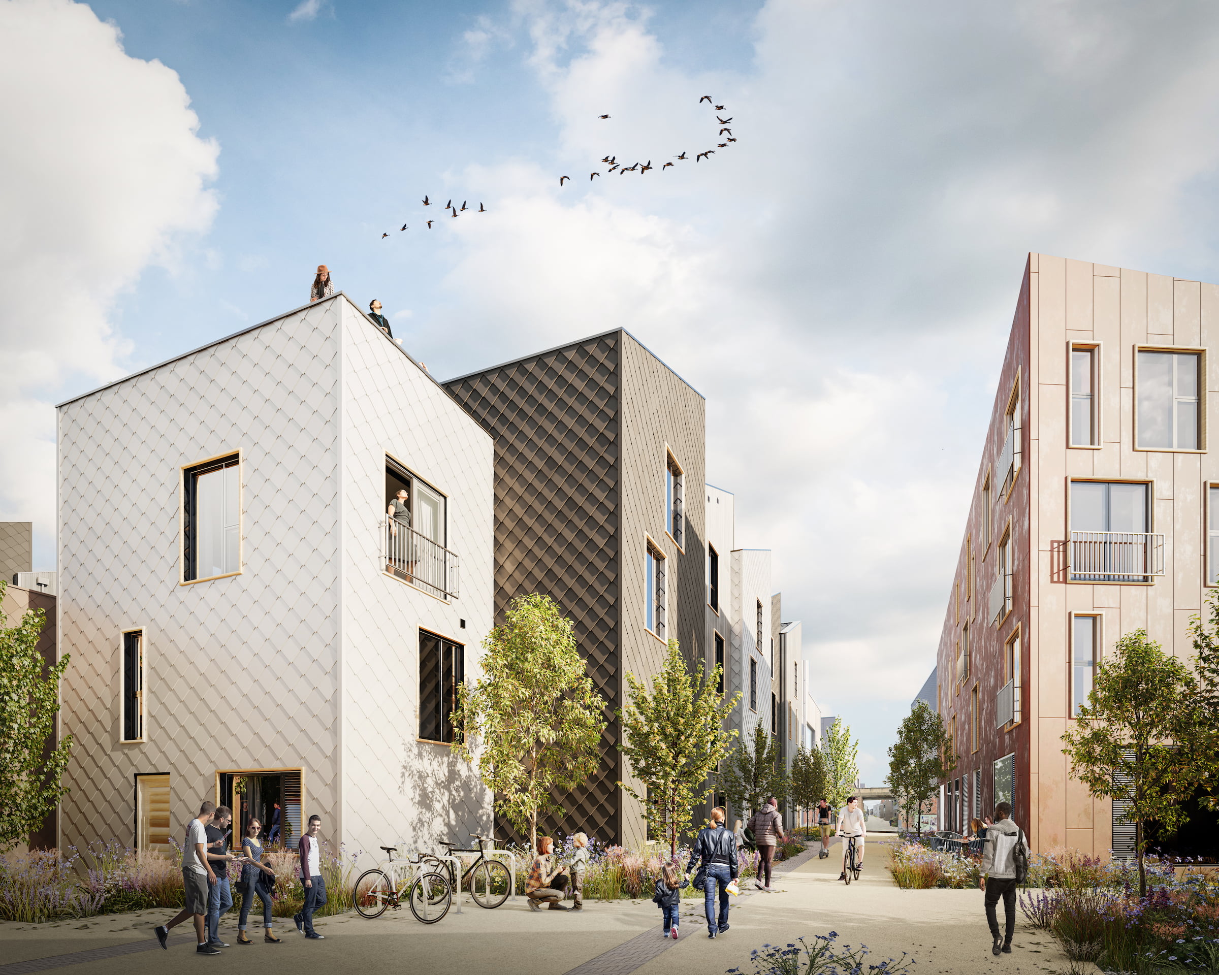 品牌形象设计。新区拥有设计独特的美丽家园、开放广场、绿地和无车步行街。为城市带来一片绿色。房屋的每个方面都是自然可持续的,从它们的建造方式到它们的保温效率。