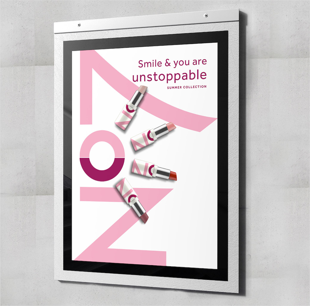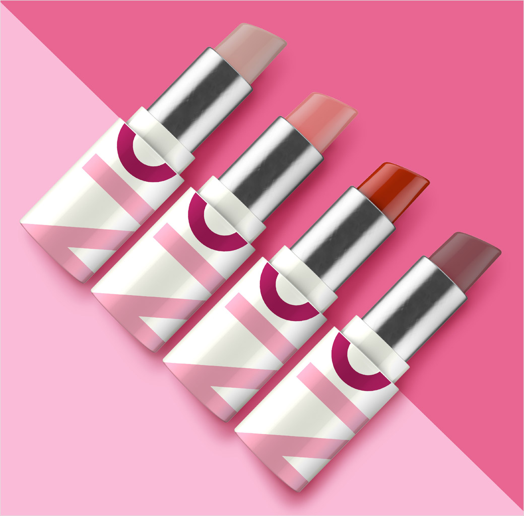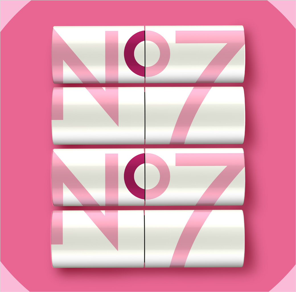 该创意机构还对 No7 标志进行了调整,在 No7 的“o”内加入了一个微笑图标,并以双色调粉红色在唇膏外壳上展开。
