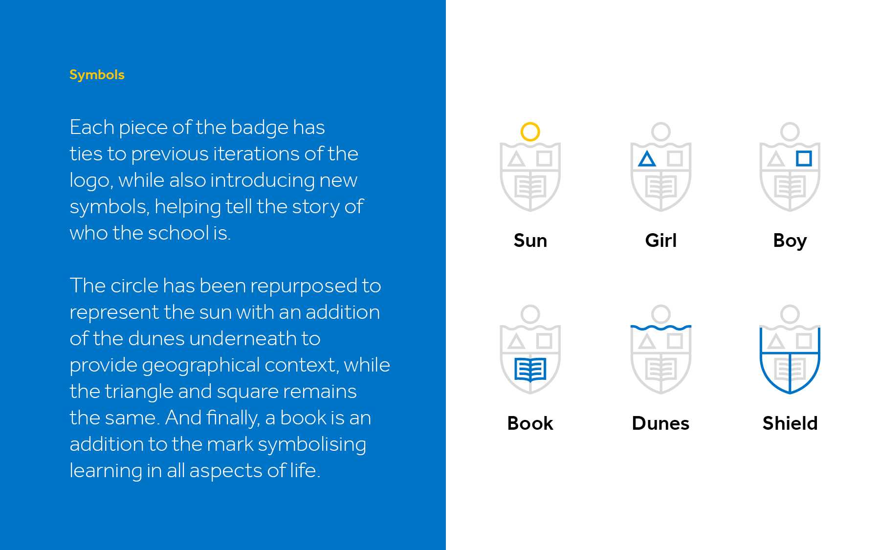 徽章的每一部分都与徽标的先前迭代相关联,同时还引入了新的符号,有助于讲述学校是谁的故事。圆圈已被重新用于代表太阳,并在下面添加了沙丘以提供地理背景,而三角形和正方形保持不变。最后,一本书是象征生活各个方面学习的标志的补充。
