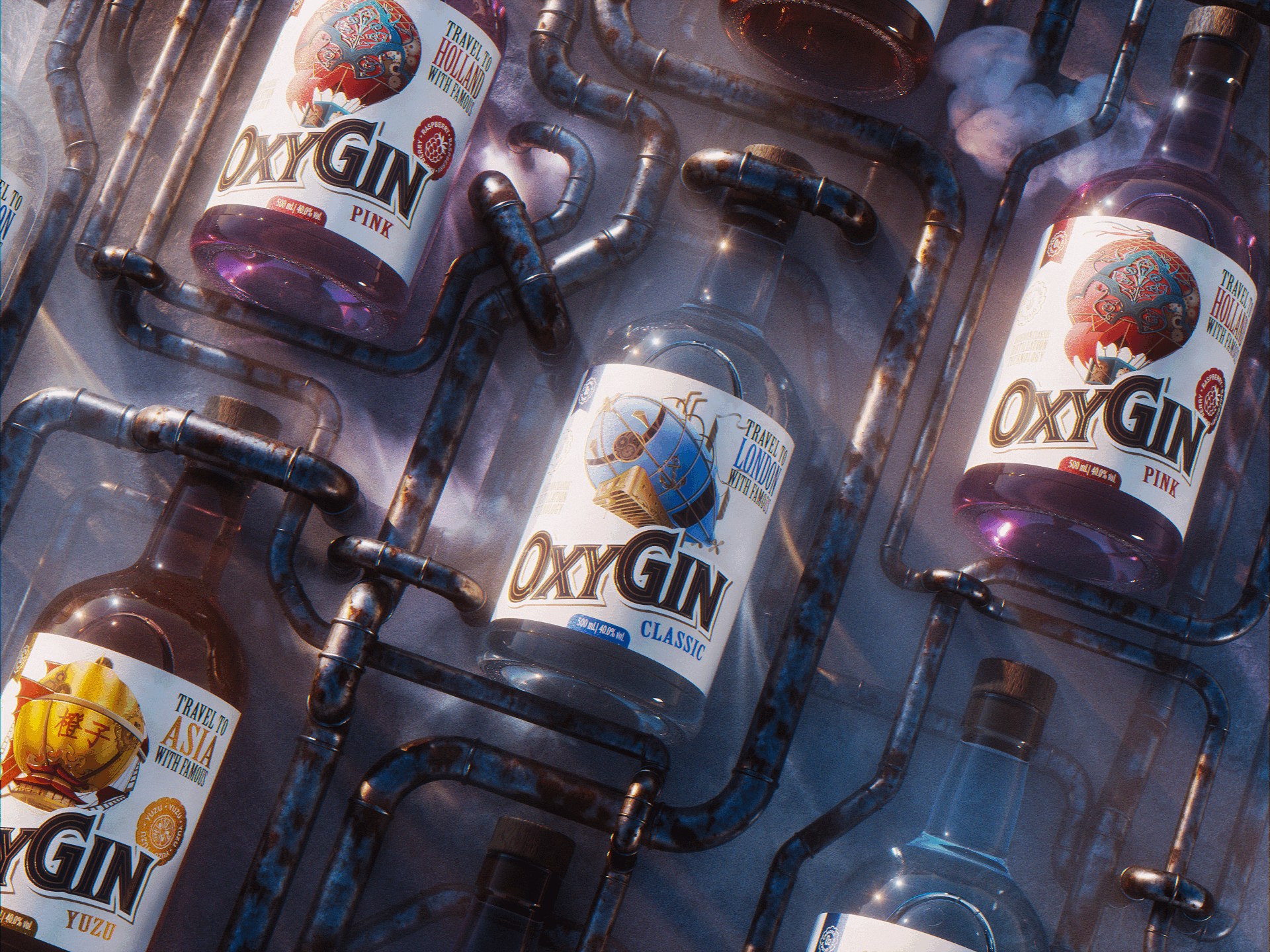 设计理念建立在维多利亚时代的蒸汽朋克美学之上,这使我们能够将最英式的饮料联系在一起,建立一个清晰的系统来区分不同的SKU,并强调乘坐飞艇旅行的想法。为什么是飞艇和气球?这是一种相当典型的蒸汽朋克运输方式,主要的视觉标志是一个充满空气的巨大圆顶,它强调了这个名字,并再次告诉我们饮料的轻盈。除了飞往伦敦的航班上的经典杜松子酒外,您还可以向东行驶,品尝柚子杜松子酒或招牌粉色覆盆子杜松子酒,气球轻轻地漂浮在日落中。