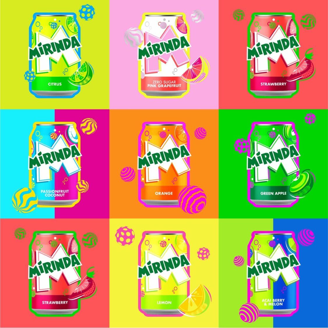 Mirinda的设计在概念上与特别制定的指导原则“制定M-pact”相关联。从那时起,从文字商标中分离的大写字母“M”成为中心设计元素。此外,百事可乐表示,“旋转的球、嘶嘶作响的气泡和热情的水果插图旨在传达一种俏皮和充满活力的感觉。蓝莓、西瓜、苹果、石榴、菠萝、香蕉等品种通过鲜艳的色彩和适当的插图进行识别。总的来说,米琳达有50+种口味。
