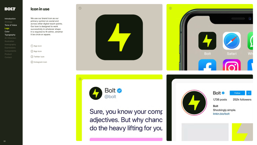 Koto.Studio主导了Bolt品牌的形象重塑。Koto在设计过程中,保留了原先的闪电图标,同时将标志和文字标志完美融合,通过负空间将闪电图标隐匿其中。品牌升级的目标是更具现代感、更有活力,并通过"闪电黄"配色来凸显BOLT一直以来响应金融服务需求的重要性。