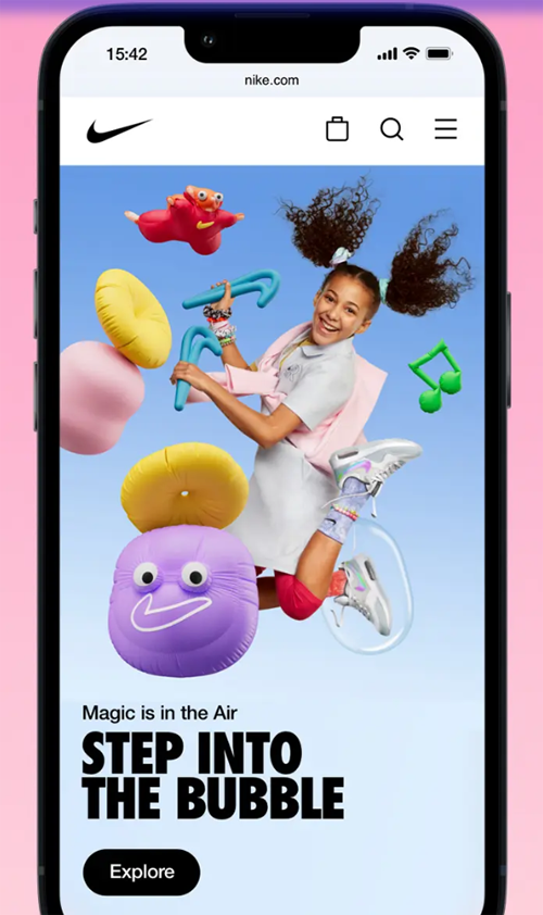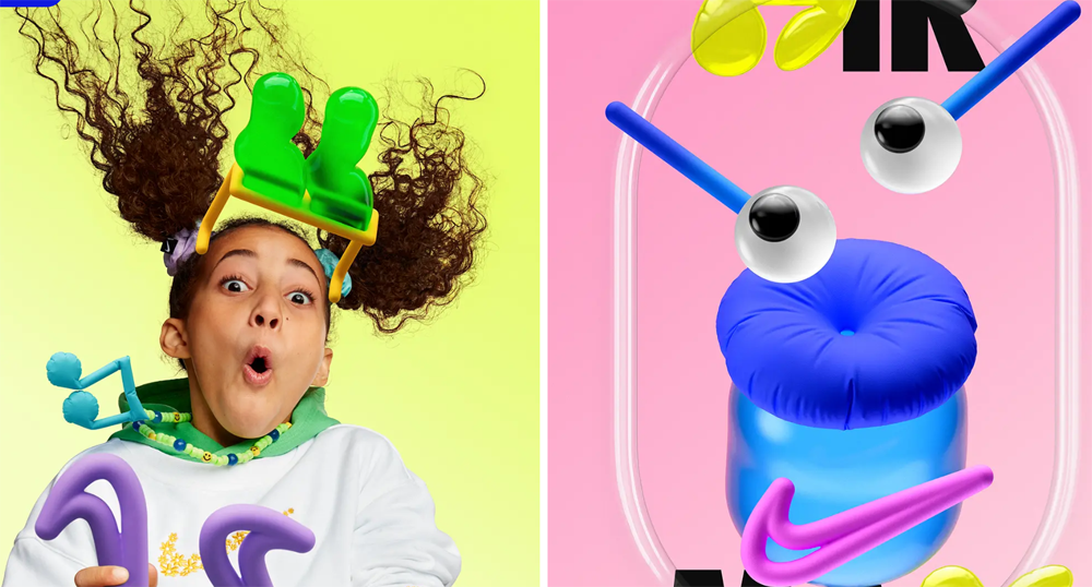 Nike Kids品牌系统的核心在于其独特的3D气泡字体和完整的设计系统。这些设计元素与庞大的充气3D角色和物体库相结合,形成了一个充满趣味的视觉世界。这些角色包括恐龙、飞行甜甜圈、带翅膀的披萨以及耐克蜱虫,每个元素都充满了俏皮与活力,展现了纯粹的能量。这种“充满泡泡”的设计不仅吸引了孩子们的目光,也激发了他们的创造力和探索精神。