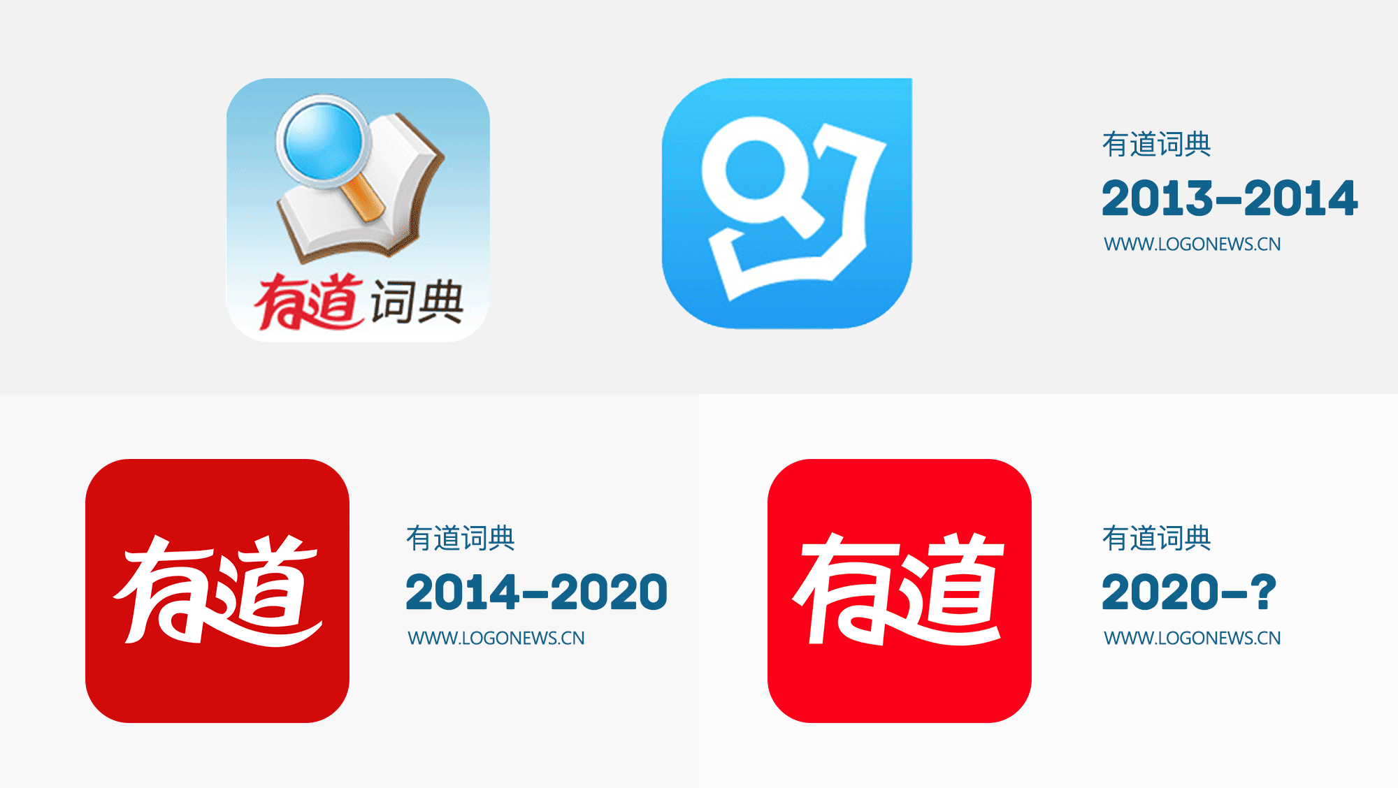 网易有道词典新旧图标对比 以下是有道词典的图标演变历史(可能不全哈): 道词典的图标演变历史 2020年10月27日,有道对自己的LOGO开始动「刀」,在保留原始字体结构不变的情况下将用了十二年的「有道」二字改成了笔画笔直,粗细相同且转角锐利的全新风格。 有道中英文新旧LOGO和品牌色对比 改了中文,英文当然也会跟着改动。和中文字体有点不同的是,英文并没有考虑原字体的独特造型,简单粗暴的换上了一款无衬线体。