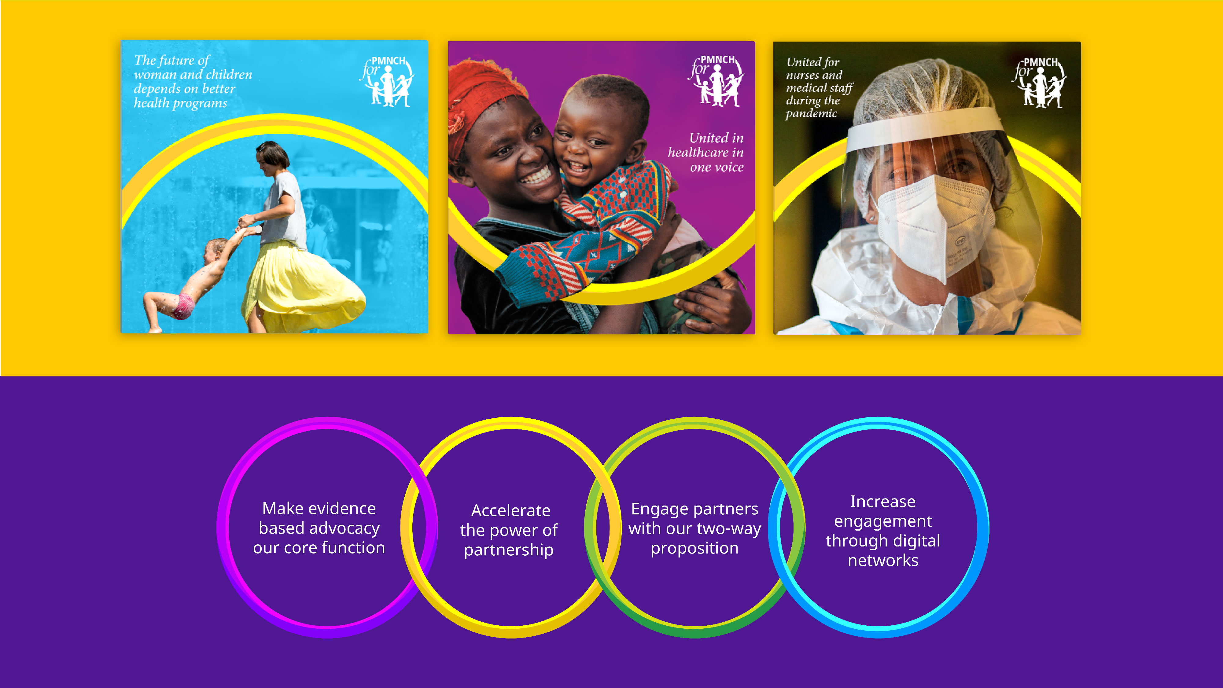 Lopez Design 的战略品牌推广使用“PMNCH + for”一词突出了 PMNCH 的倡导立场,使身份与其核心目的保持一致。这使得他们的众多目标有多种表现形式——PMNCH 促进妇女、儿童和青少年健康;共同促进变革,网络促进影响,联合促进健康权利。PMNCH 的新身份放大了合作伙伴的声音,以倡导妇女、儿童和青少年的健康和福祉,尤其是最弱势群体。