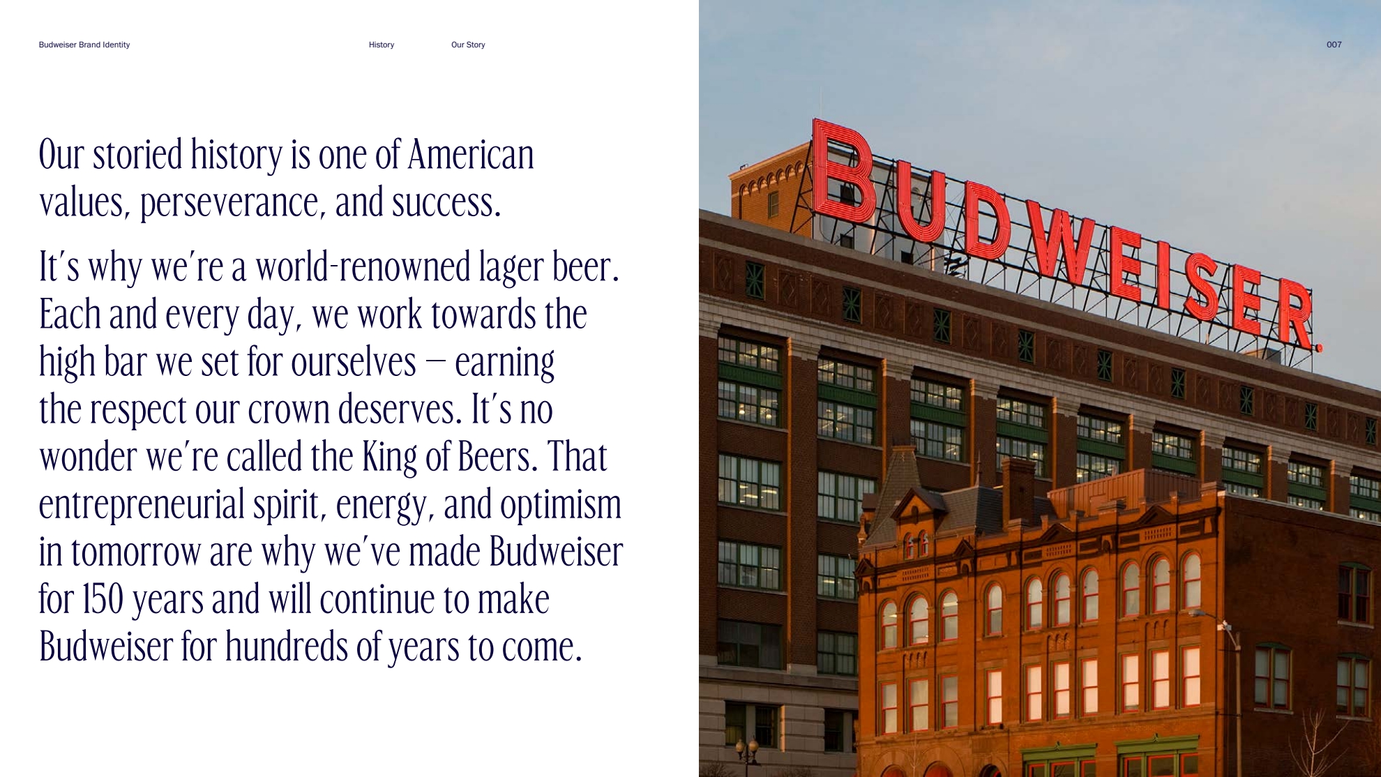 百威啤酒凭百年历史积淀,始终坚持着卓越的口感和优良的品质,获得全球消费者的认可与喜爱,荣登世界各地销售额最高,销售量最大的啤酒宝座。更是凭借对诸如奥运会、上海世博会、FIFA世界杯足球赛以及NBA篮球赛等世界级盛事的热忱赞助,以及诸如“百威音乐王国”这类年轻群体热烈追捧的时尚行列,充分展示出王者气派,毫无争议坐实了“啤酒之王”的称号。精简后的新LOGO设计、VI设计系统将使百威在全球品牌视觉上更好地实现“统一性”。