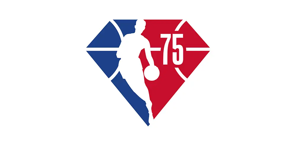 周年庆LOGO设计。LOGO整体以钻石形状为基础(代表永恒和闪亮),并以红蓝色块和白色线条将其分割出篮球的局部特征。NBA标志性的「LOGO MAN」剪影旁边多了一个数字75。