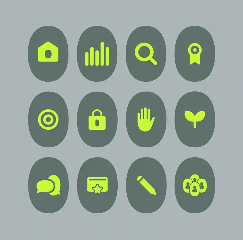 以品牌符号的椭圆造型,设计师创造了一个独特的轮廓形状,在整个视觉系统中,该形状会不断出现。例如每个会员的个人资料卡片中,上传的头像将会放置在椭圆框中;网页或app的应用图标均有着椭圆的背景。