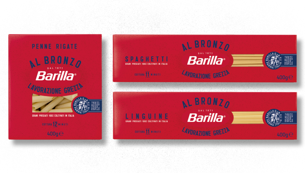 在品牌履行其减少包装中塑料使用的承诺时,这种色彩对比度的衰减和印刷的加强也可以减少标志的闪亮和耀眼的外观。较暗的色调赋予颗粒状和粉状的外观,表明新的优质“Al Bronzo”浆料的粗糙度和条纹在一定程度上突出 ,在该集团的意大利工厂生产,取代了旧的“Academia Barilla”系列,该系列正在努力实现差异化。这些新包装,完全是纸板,采用新的深红色/酒红色标志,上面贴有许多图形元素(包括上面显示的第一个 Barilla 标志),这些元素加强了意大利面的质感,是粘稠酱汁、放纵的代名词和有嚼劲的味觉体验 。一个强烈的环境信息加上对增强质量的承诺,这会激发我们的胃口,因为全球发布将在法国独家举行……在 Monoprix!