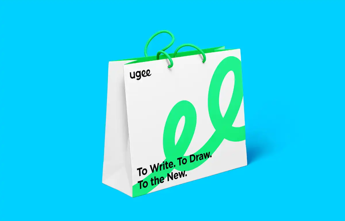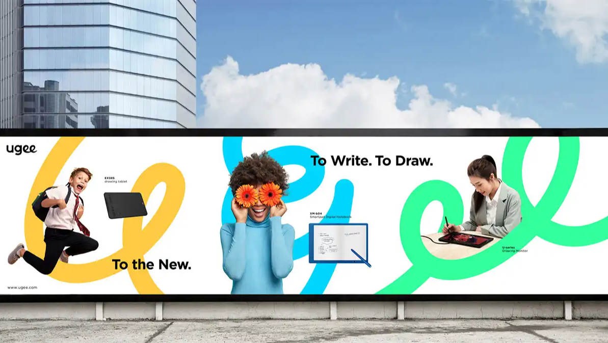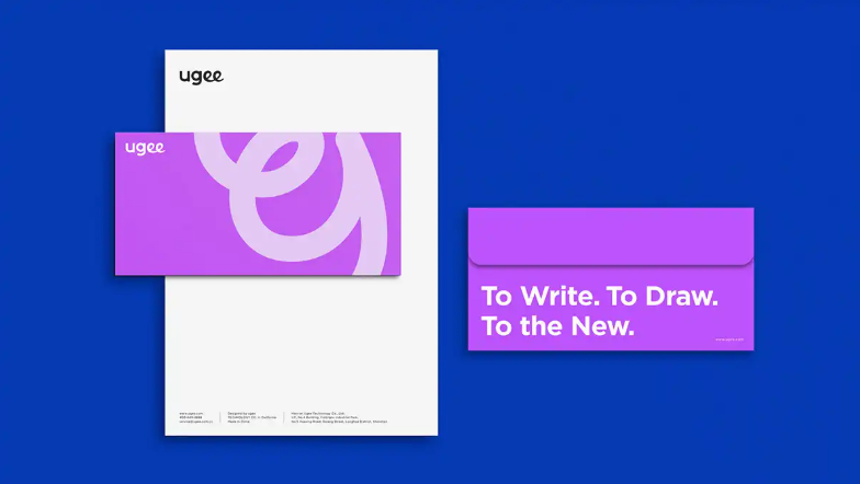 新LOGO设计的理念承载着新形象,由代表科技的无衬线字ug 与代表艺术的手绘ee 组合而成,兼具科技与人文的调性。辅助系统以多元丰富的线条,勾勒出ugee 全新的品牌理念「绘写新世界,解锁新可能」。通过不同的线条处理手法,将产品写与绘的特色展露无遗。