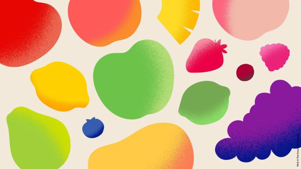在这种情况下,插图显示了抽象的水果,以喷枪和模板的风格着色,赋予其清新的外观和颗粒状的质地。