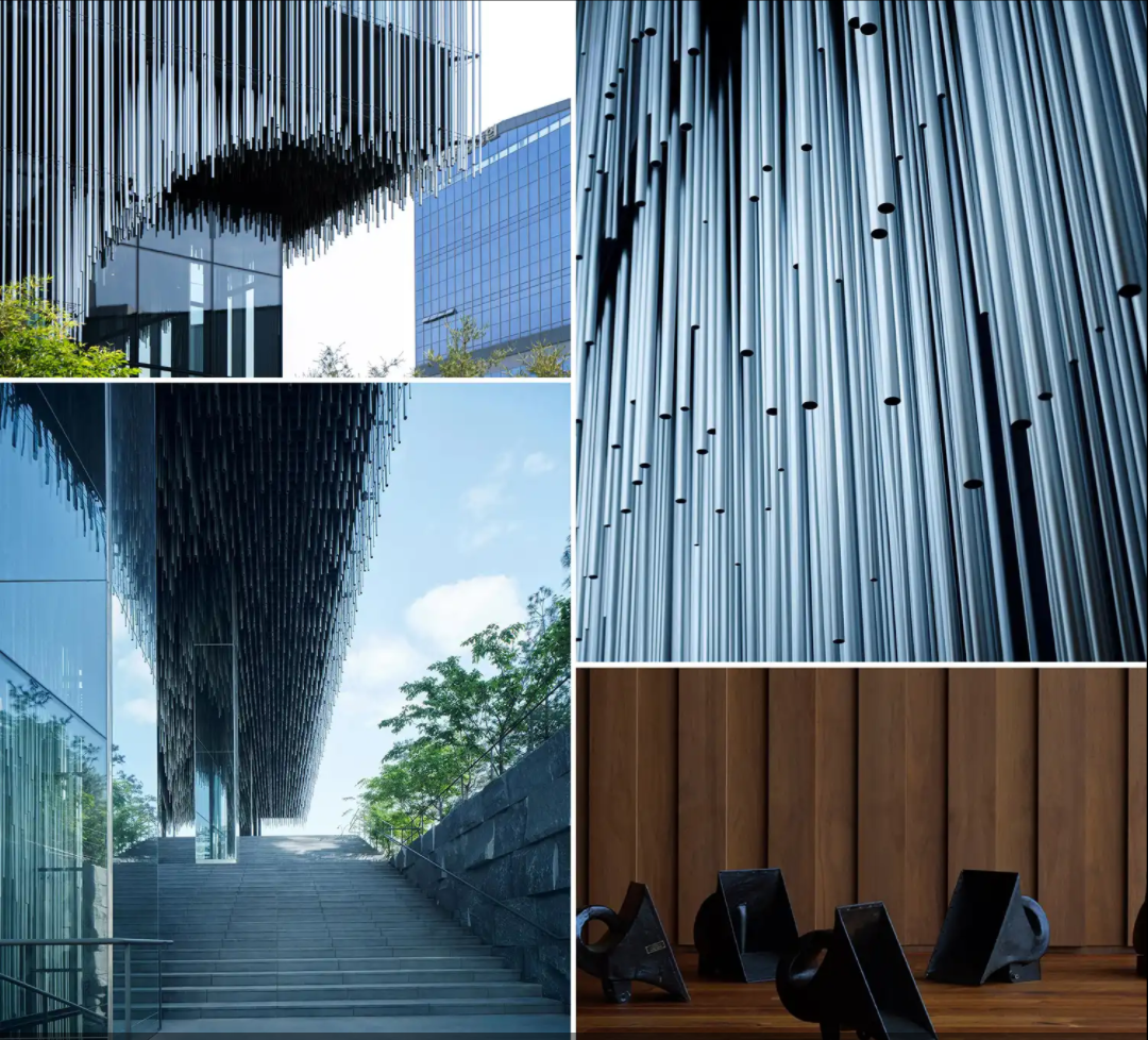 博物馆建筑的外面由2万根明亮的铝管垂直环绕,营造出光影渗透到森林的效果,表达城市的自然。内部设计充分考虑了声音。体验的需求,木质结构与台阶设计不仅美观,还能有效增强空间的吸音效果,为访客创造一个沉浸式的听觉环境。