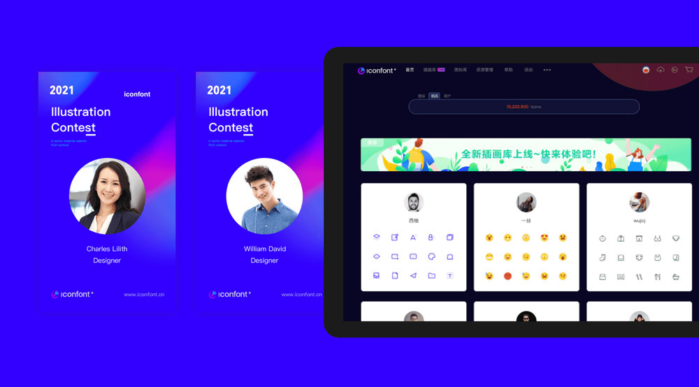 随着设计师的不断加入 Iconfont ,该平台从最初的单色图标升级到多色,除了成千上万的系列图标库,还增加了插画库板块。 Iconfont 希望通过品牌产品和品牌形象的升级,围绕「设计」,「有趣」和「原创」三个关键词在设计上传达新的品牌理念,寓意平台的矢量、设计与内容丰富多彩。