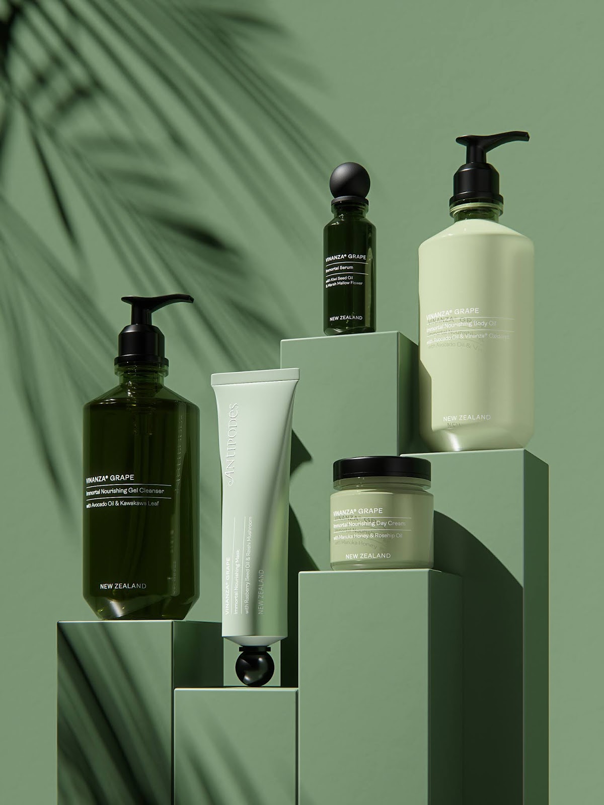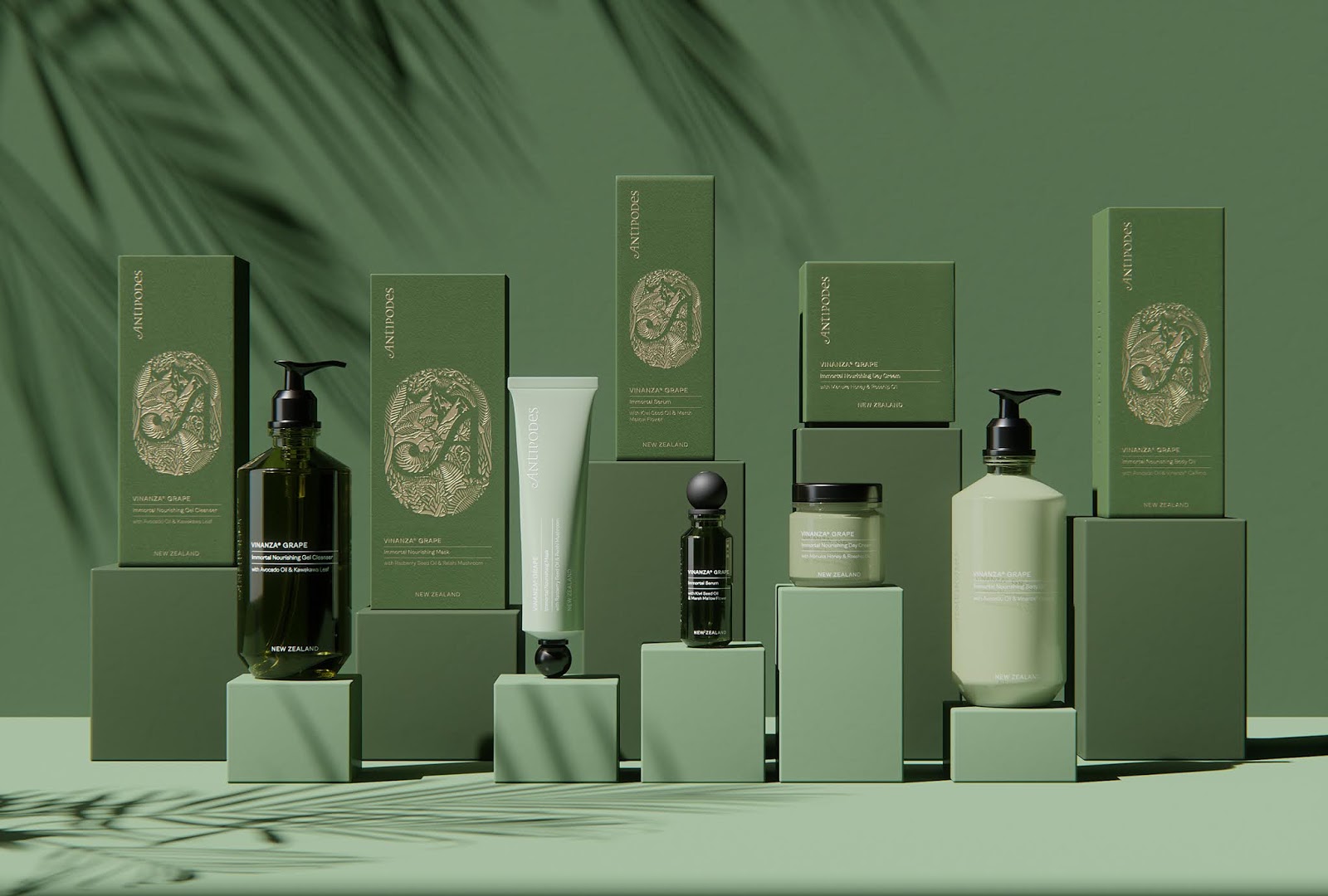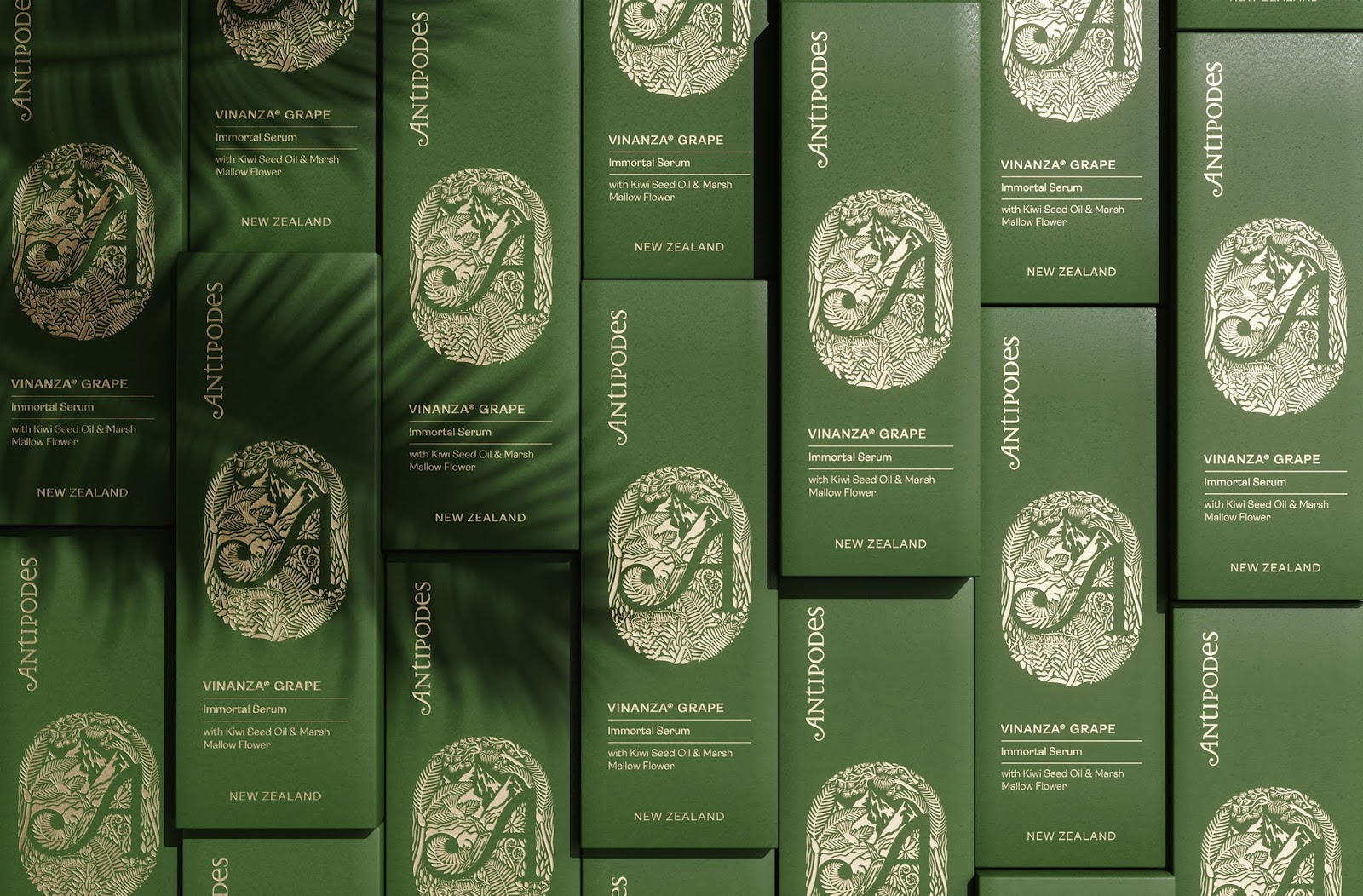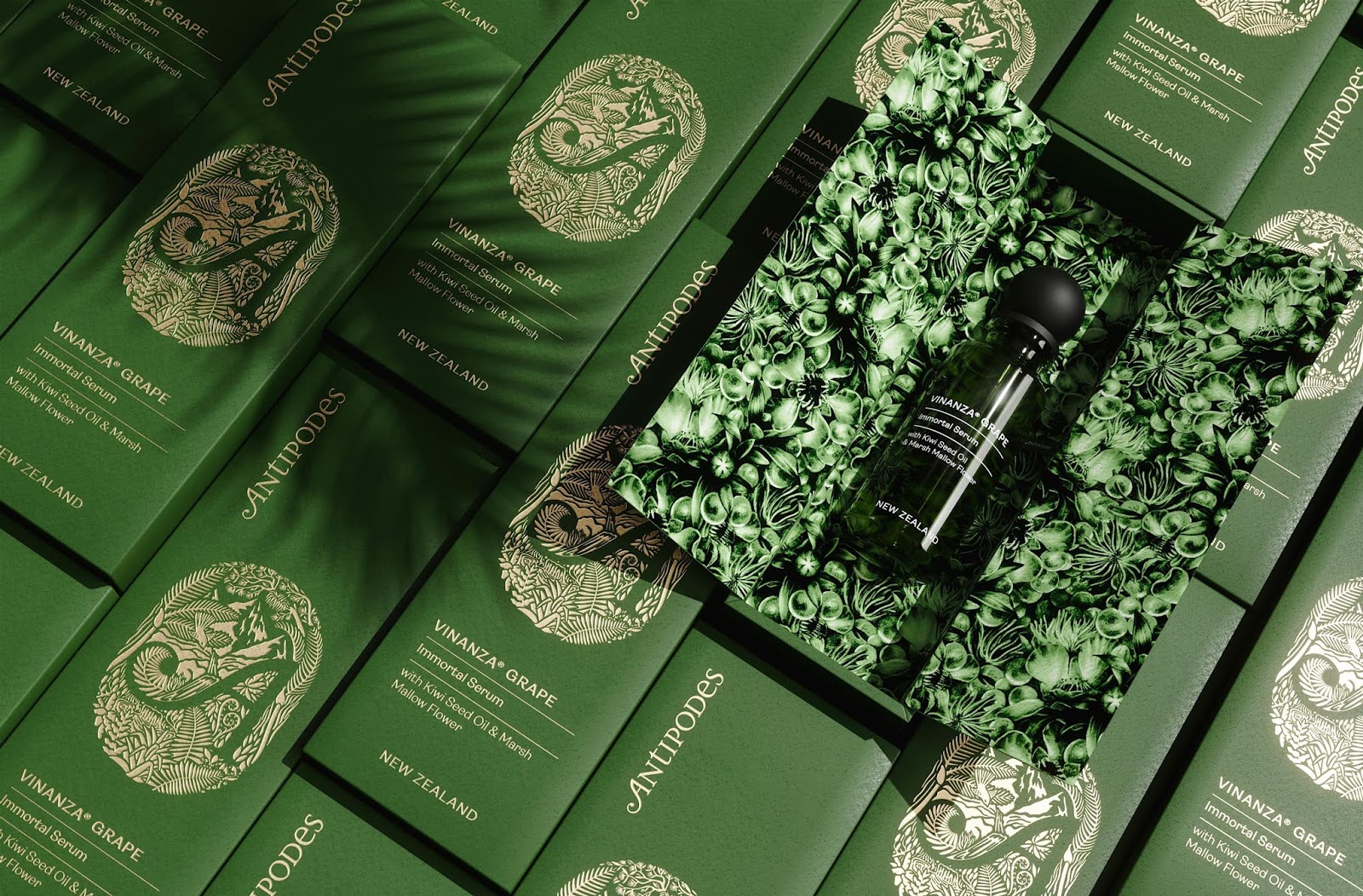 Antipodes的品牌专注于在世界边缘的茂密绿色新西兰森林中提供世界上最优质的护肤品?!?Vinanza葡萄是一种革命性的抗氧化剂提取物,可持续地从Marlborough sauvignon blanc葡萄种子的副产品中提取?!?该声明是我们对新Antipodes设计概念的主要灵感。
