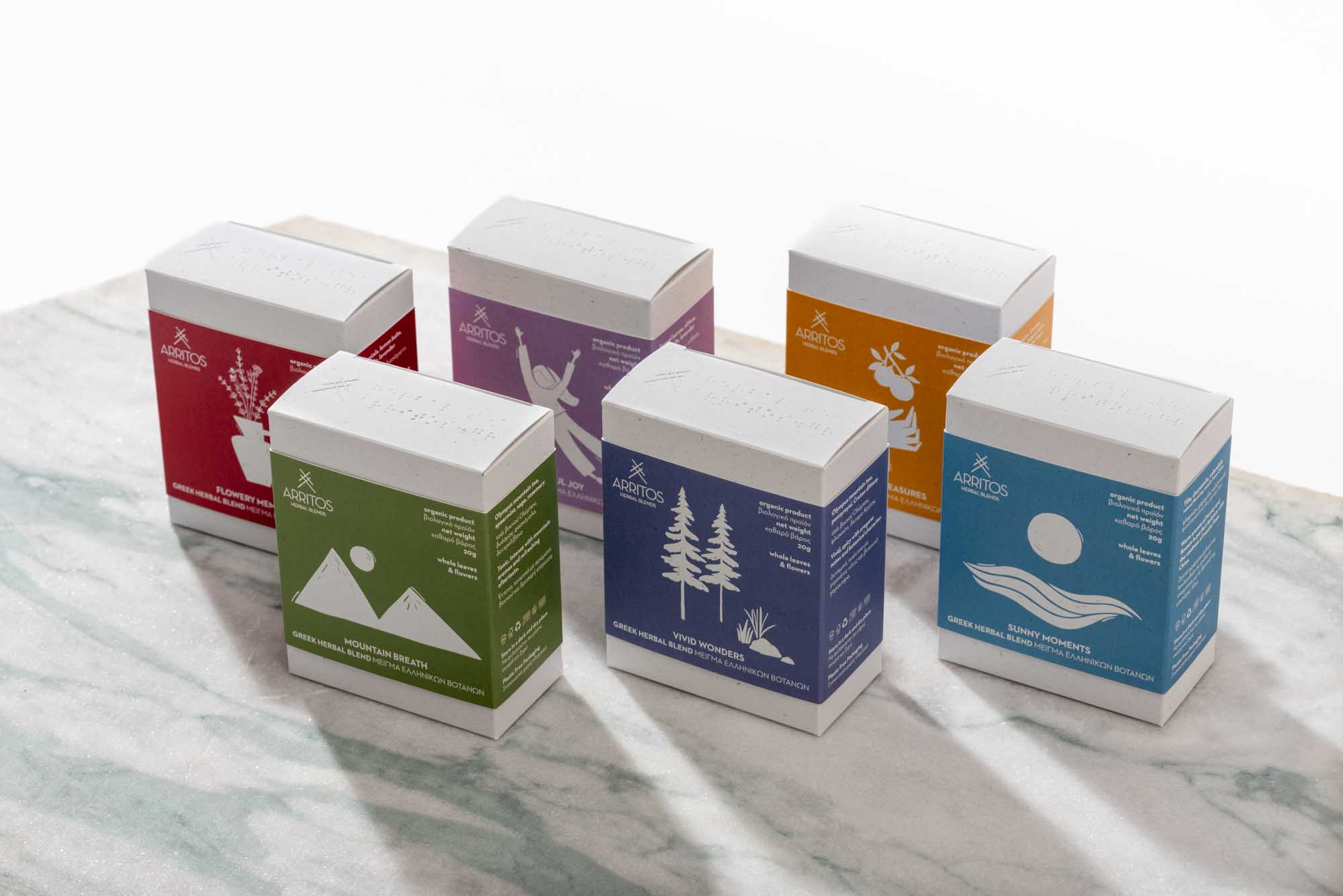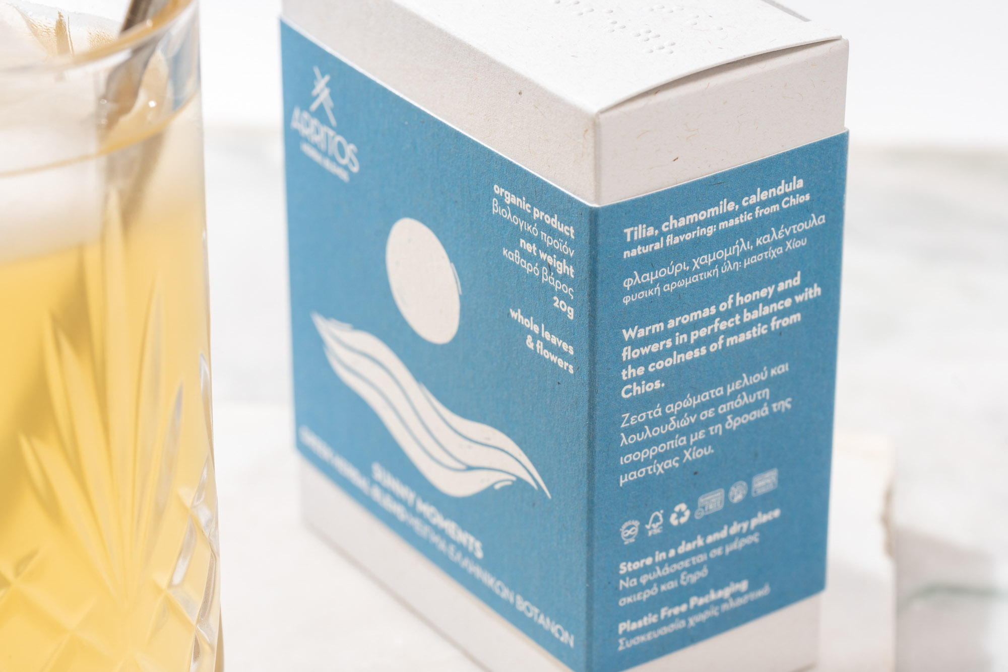 通过 Arritos 的新包装,我们力求提供一种创新、经济和实用的解决方案。关于我们遵循的设计方向,Arritos 要求我们创建包装,以突出每种混合物的特性,并激发茶饮者喝冷热饮的灵感。我们决定不通过切割机展示产品,因为这会改变内容的质量。我们创作的插图的灵感来自每种产品,而不是成分,而是体验。在包装的顶部,除了压印的 Arritos 符号外,您还会发现适合视障人士使用的盲文字符。在材料方面,避免在整个包装中使用塑料是品牌和我们的目标之一。同时,我们选择了再生纸和可回收纸。