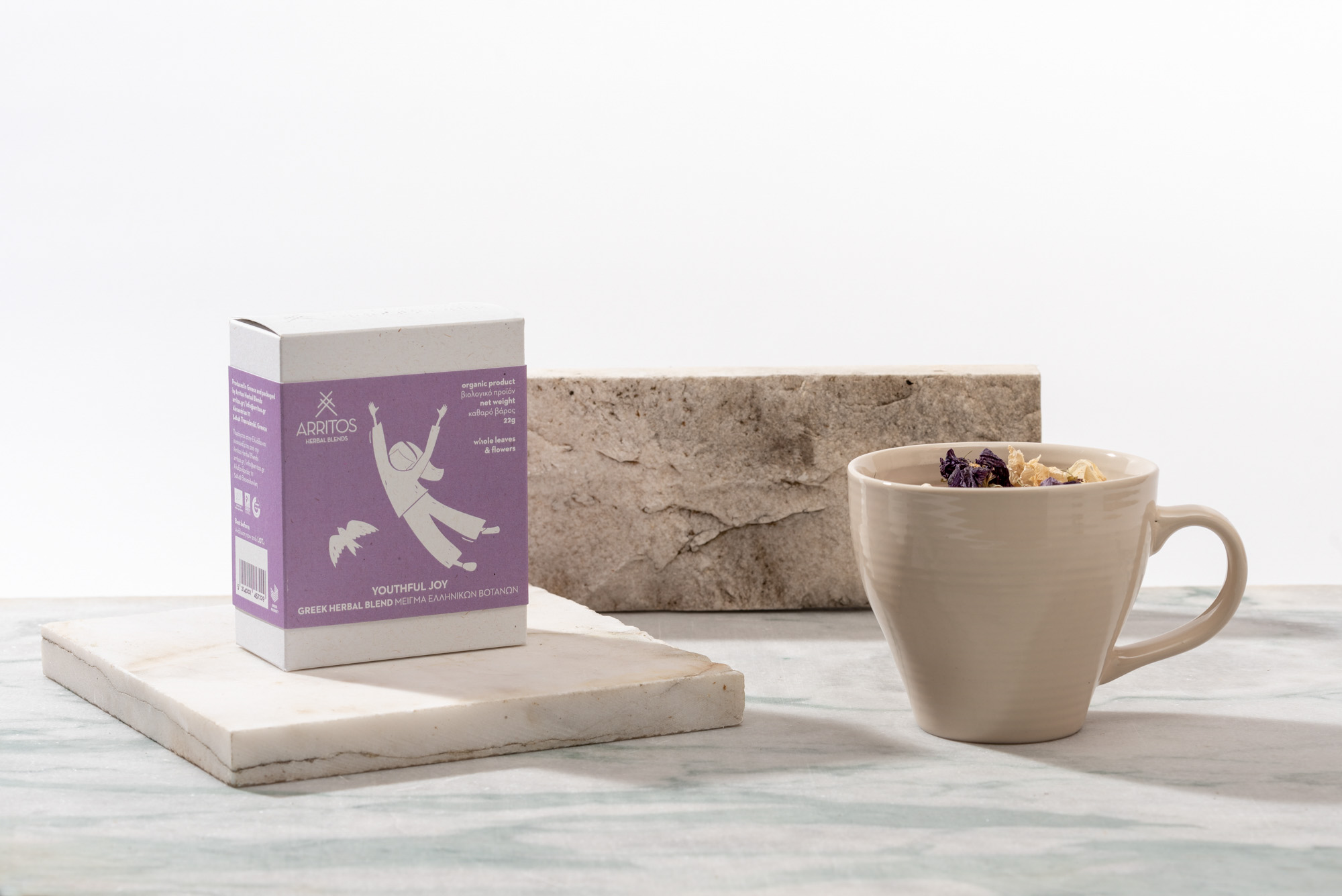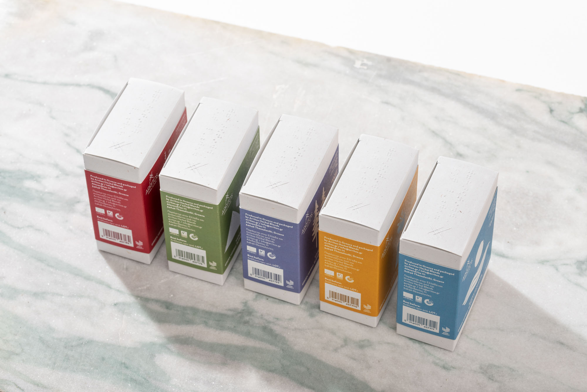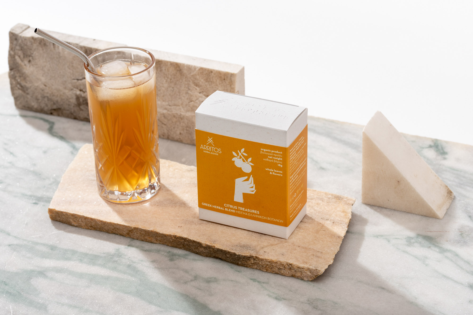 茶饮包装设计的目的是将这一概念形象化。这个可视化的起点是标志,一个由交叉线组成的缩写“A”,象征着无法用文字描述体验。同时,符号的形式也作为对传统的参考,Arritos 与之相连,将希腊村庄屋顶的木梁形象化。