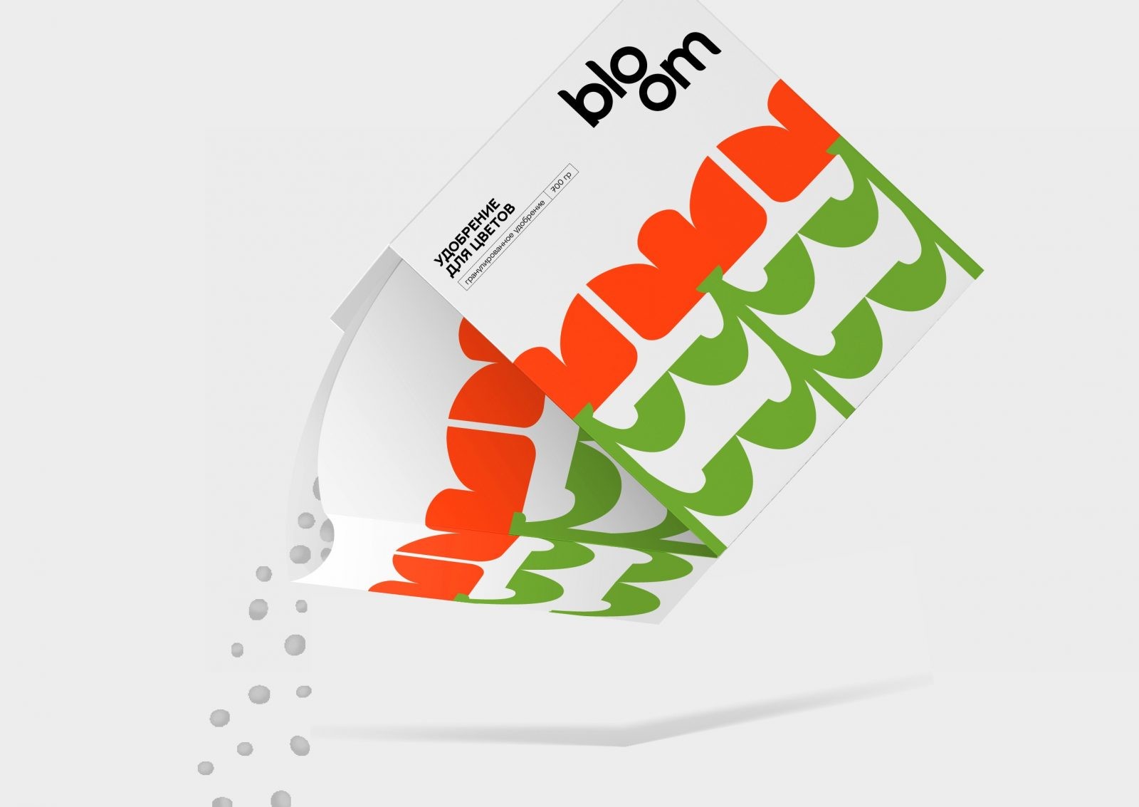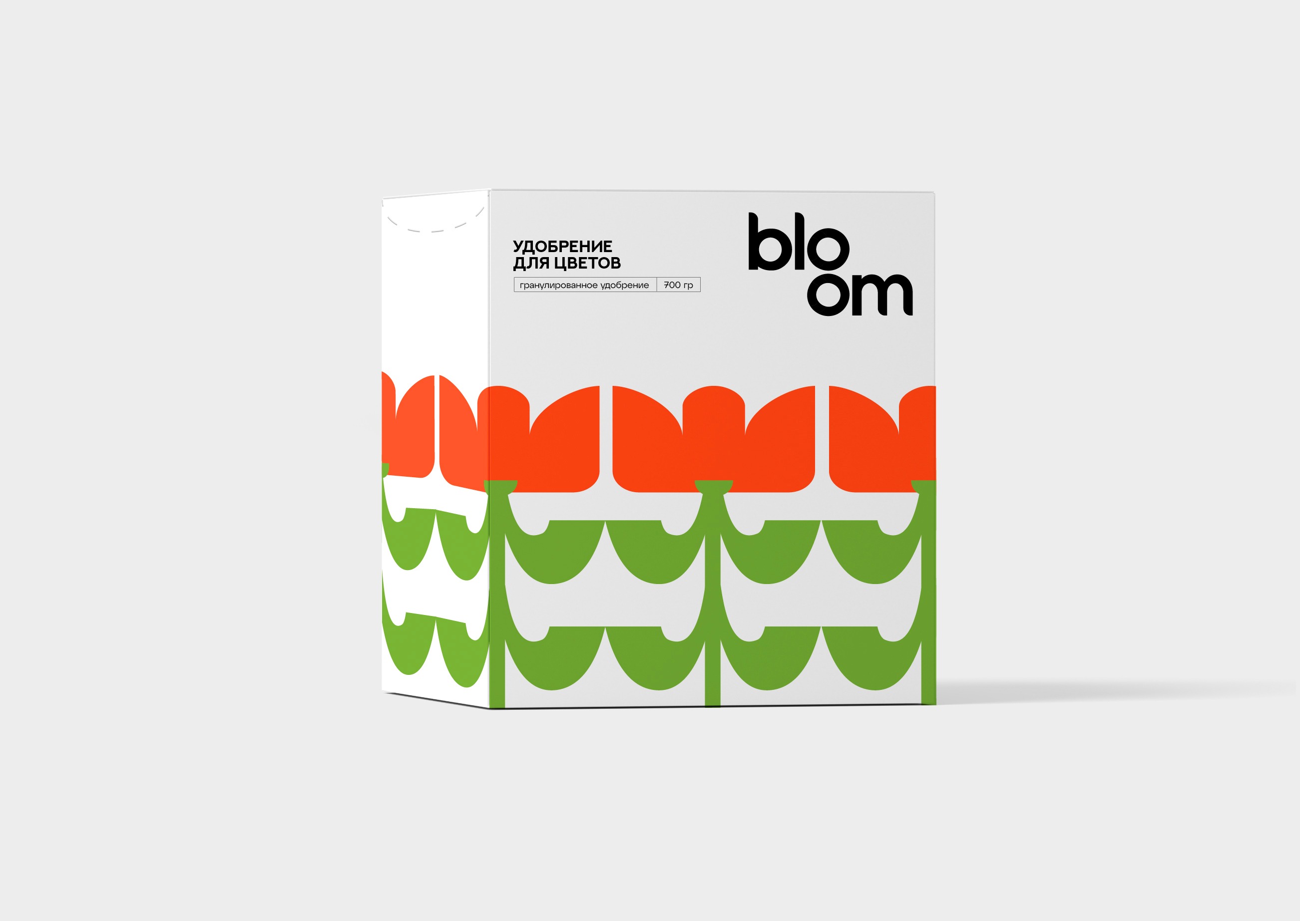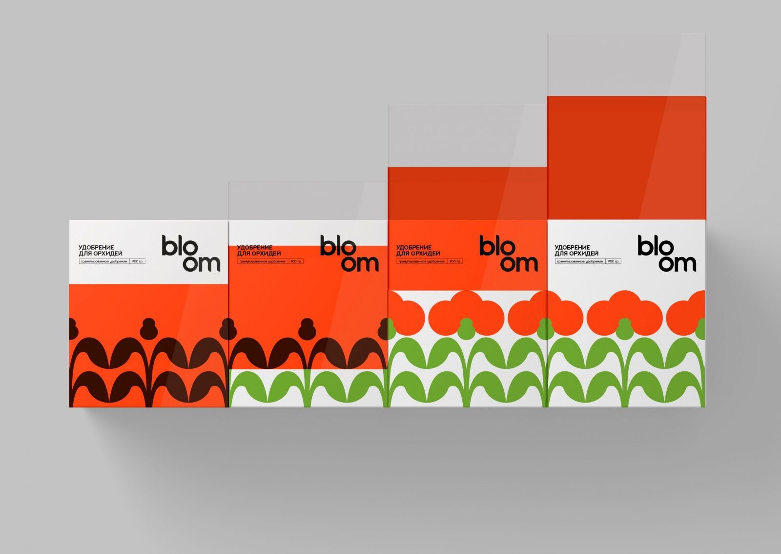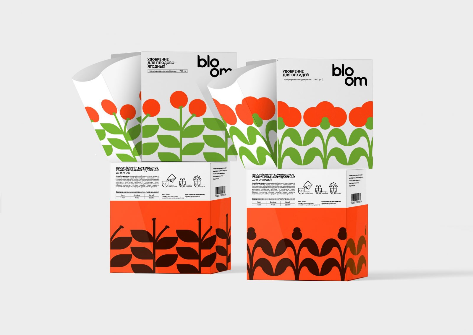 该系列包含四包肥料:用于兰花、用于花卉、用于水果和浆果、用于落叶。每个包都有自己的特色图形。盒子四面的花卉图案很无聊,在架子上它形成了一个大草坪,这使得 BLOOM 从竞争对手中脱颖而出。此外,该产品易于运输。