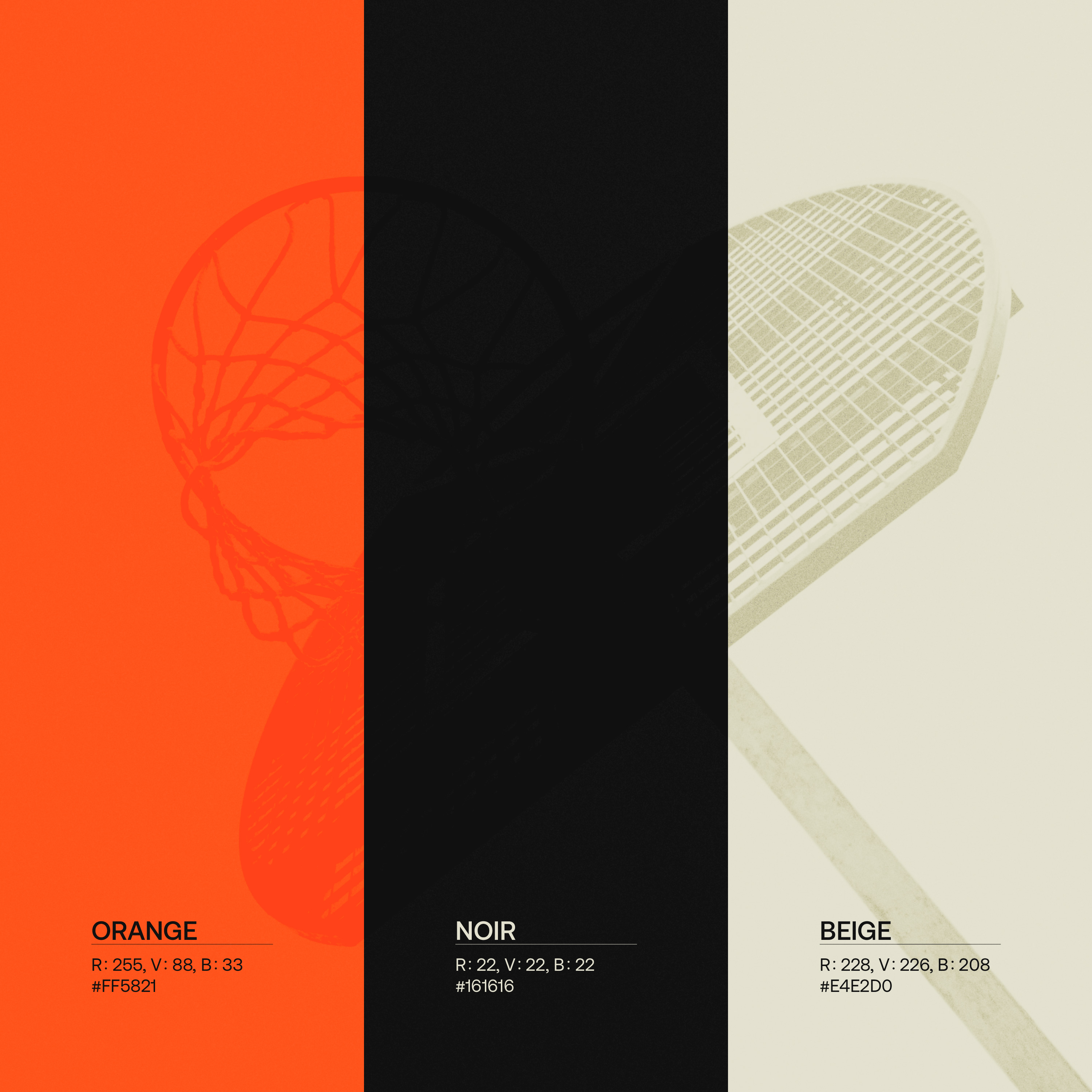 色彩方案:采用现代时尚的配色逻辑 —— 以三个地区国旗的主色调为基础,选取红色与黄色作为主色调,二者融合衍生出与篮球运动关联紧密的明亮橙色;引入深灰色作为点缀,灵感源自篮球表面的线条颜色;最后加入米黄色,为整体色彩增添柔和感与连贯性。